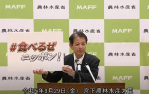 가리비 1인당 연간 5개만 먹자!미야시타 이치로 일본 농림수산대신이 29일 기자회견에서 이렇게 호소했다. 그때 그가 손에 들고 있던 팻말(피켓)에 적힌 문구는 “막고 말거야, 닛뽄(일본)!”일본의 후쿠시마 핵오염수 해양 투기에 반발한 중국이 일본산 수산물 수입을 전면 금지한 8월 24일 이후, 홋카이도에서 생산돼 주로 중국에 수출돼 온 가리비 냉동제품이 창고에서 천정에 닿을 정도로 산처럼 쌓여가고 있다. “먹고 말거야, 닛뽄!” 가리비 소비 캠페인일본 농림수산성에 따르면, 일본산 가리비는 중국과 홍콩에 연간 17만 9천t(2022년