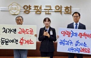 (본 기사는 음성으로 들을 수 있습니다.) 윤석열 대통령 부인 김건희 씨 일가의 특혜 의혹이 불거진 서울-양평 고속도로의 시작점과 종점에 있는 지역 정치인과 주민들이 한 자리에 모였다. 이들은 서울-양평 고속도로는 양평만의 문제가 아니라 서울·경기·강원·충청 등 전 국민들의 문제라고 강조하며, 서울-양평 고속도로 백지화를 철회하고, '김건희 고속도로 게이트' 국정조사와 특검을 실시하라고 한목소리를 냈다.더불어민주당 경기도당과 민생경제경구소, 송파연대회의, 생활정치네트워크 여민동락, 양평 경실련, 토지+자유 연구소 등 10여개 단체