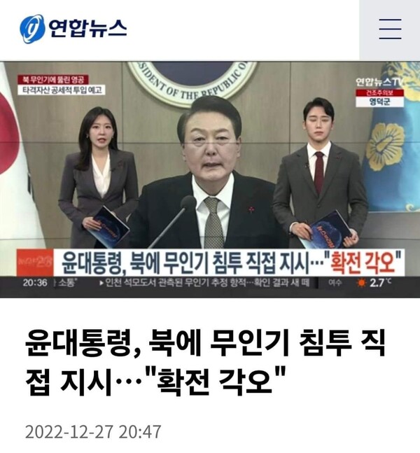2022년, 북의 무인기가 윤석열의 집무실이 있는 용산 근처까지 와 정찰비행을 하고 돌아갔다는 의혹이 제기되었다. 당시 윤석열은 한편으로는 경기를 일으키며 두려워하고 다른 편으로는 보복하겠다며 이를 갈았을 것이다. 그가 엄청 격노했다는 것은 12월에 북에 무인기 침투를 직접 지시하면서 ‘확전을 각오’하겠다고 말했던 것만 보더라도 잘 알 수 있다.(연합뉴스, 2022년 12월 27일)