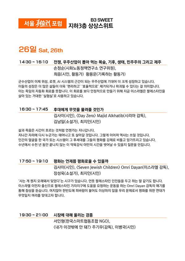 토론회(포럼)에는 김남일 소설가, 김사이 시인, 희음(시인), 황용운 활동가, 마지드 알카팁(시리아 감독), 오므리 다얀(이스라엘 감독), 장성욱 소설가, 최지인 시인, 서인형 한국스마트협동조합 이사장, 이병국 시인, 세월호 유족인 유민아빠 김영오, 김정곤 영화연구가, 김대현·남승원·최진석 문학평론가, 정원옥 문화사회연구소 대표, 박수영 마을미디어 활동가, 주기우·조승민·조정웅 초청 감독 등이 참석해 관객들과 다양한 주제로 열띤 대화와 의미있는 토론을 벌일 예정이다.