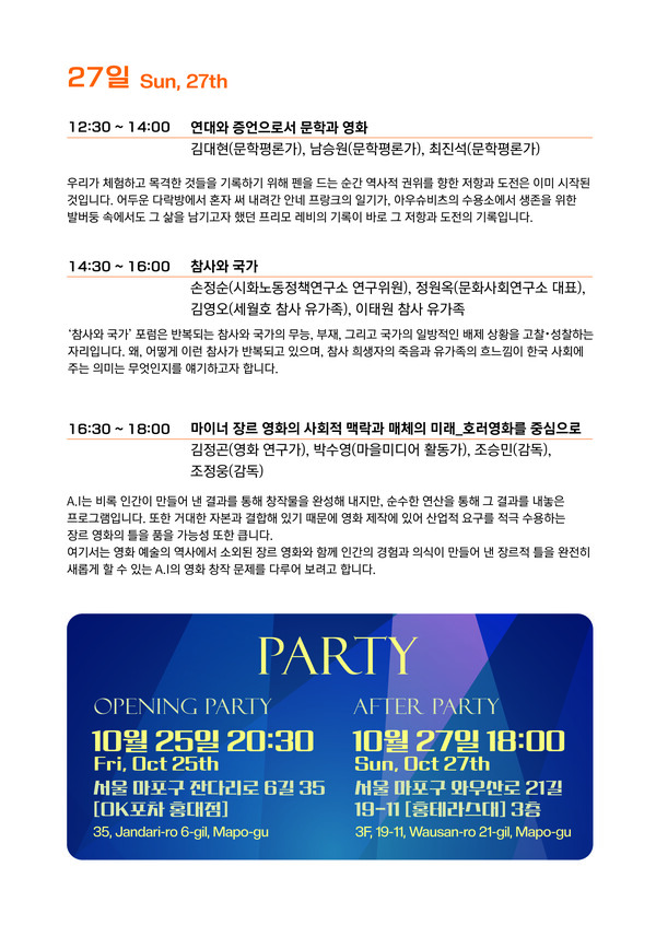 * 서울휘슬러영화제 개막 파티는 10월25일 오후 8시30분 서울 마포구 잔다리로 OK포차 홍대점에서, 폐막 뒤풀이 파티는 27일 오후 6시 마포구 와우산로 홍테라스대 3층에서 열립니다.