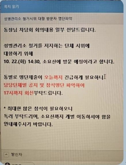 또 철거 찬성 단체 쪽에 보낸 것으로 추정되는 '성병관리소 철거시위 대항 방문자 명단파악'이라는 SNS 쪽지에서는 "(행정복지센터) 동장님 차담회 회의내용 일부를 전달합니다"라며 "성병관리소 철거를 저지하는 단체 시위에 대항하기 위해 22일 오후 2시 소요산에 방문 예정"이라고 적혀 있었다. 아울러 쪽지에는 "동별로 명단제출이 오늘까지 긴급하게 필요하니 담당 단체별 공지 및 참석 명단 파악하여 17시까지 회신 부탁드린다" "최대한 많은 참석이 필요하오니 독려 부탁드린다" 등의 내용도 담겨 있었다.