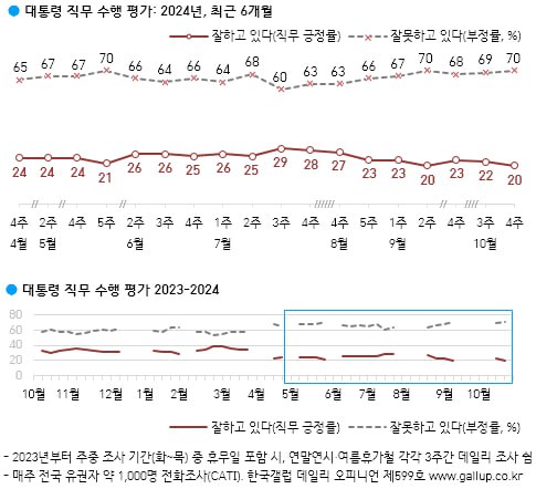 ‘갤럽’의 대통령 지지도 여론조사에서는 ‘윤석열 대통령이 현재 대통령으로서의 직무를 잘 수행하고 있다’고 보는 긍정 평가가 40일여 만에 다시 20%, 최저치로 떨어졌고, 부정 평가 역시 최고치 70%를 기록했다. 어느 쪽도 아님 3%, 모름/응답거절 7%.