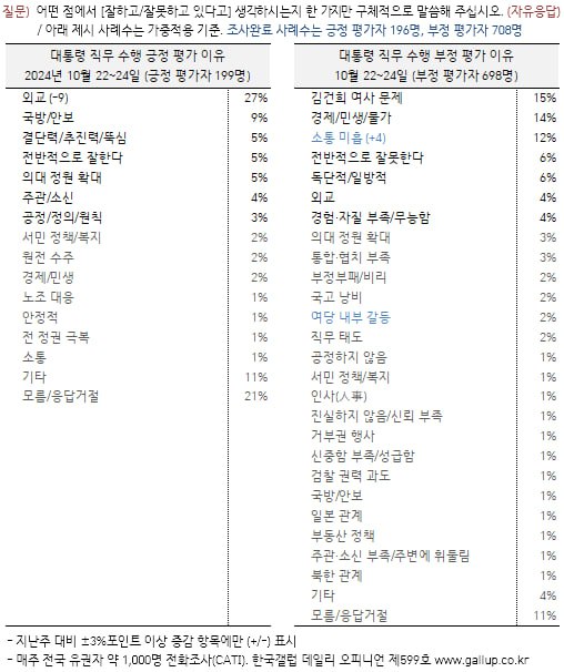대통령 직무 수행 긍정 평가자에게 그 이유를 물은 결과(이하 '가중적용 사례수' 기준 199명, 자유응답) '외교'(27%), ‘모름/응답거절’(21%), '국방/안보'(9%), '결단력/추진력/뚝심', '전반적으로 잘한다', '의대 정원 확대'(이상 5%), '주관/소신'(4%) 순으로 나타났다. 직무 수행 부정 평가자는(698명, 자유응답) '김건희 여사 문제'(15%), '경제/민생/물가'(14%), '소통 미흡'(12%), '전반적으로 잘못한다', '독단적/일방적'(이상 6%), '외교', '경험·자질 부족/무능함'(이상 4%), '의대 정원 확대', '통합·협치 부족'(이상 3%) 등을 이유로 들었다. 2주 연속 김 여사 관련 문제가 경제·민생과 함께 부정 평가 이유 최상위에 올라 있다.