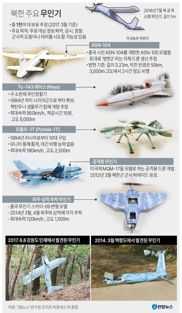 식별된 것만 총 5대인 북한 무인기는 26일 남측 영공을 5년 만에 침범해 서울, 강화, 파주 상공을 5시간 넘게 휘저었다. 우리 군은 F-15K와 KF-16 등 전투기는 물론 KA-1 경공격기(전술통제기), 아파치·코브라 등 공격헬기까지 군용기 약 20대를 동원하고 헬기에서 20㎜ 기관포로 100여 발의 사격까지 가했지만 격추에 실패했다.