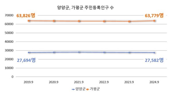 위 지도는 생활인구 중 등록인구 대비 체류인구 비율이 높은 시군을 표시한 지도다. 강원 양양군(17.4배)에 이어 내가 살고 있는 가평군은 15.6배로 체류인구 배수가 높은 군이다. 과연 두 군은 지난 몇 년간 등록인구가 늘었을까?