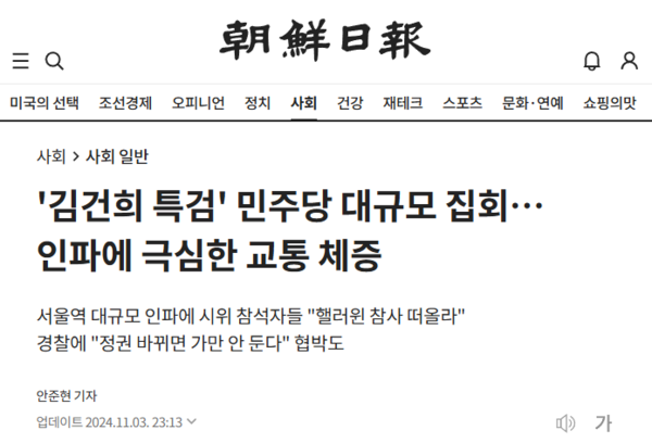 조선일보는 지난 2일 더불어민주당이 서울역 앞에서 개최한 ‘김건희 윤석열 국정농단 규탄·특검촉구 국민행동의 날’ 집회를 크게 보도했다. 이 신문이 윤석열 정부 비판 집회를 보도한 것 자체가 이례적이다. 그러나 기사의 의도는 따로 있다. 기사의 제목은 이렇다.