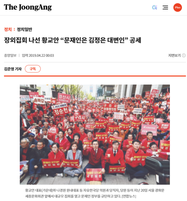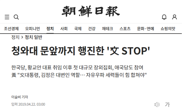 조선일보와 그 아류 매체들은 과거 민주당의 장외 집회에 대해 그 자체를 부정적으로 보아왔다. 국회 내에서 해결하지 않고 거리로 나와 국민을 선동한다는 것이다. 그러나 자유한국당 장외 집회에는 그런 말을 결코 하지 않는다. 주최 측과 참가자들이 외친 반정부 주장과 구호(“문재인 물러가라”“독재타도” 등)를 있는 그대로 전달할 뿐이다. 황교안 대표가 지지자들에게 집회 참여를 독려했다는 언급도 전했다. 같은 날 중앙일보도 “황 대표가 장외투쟁을 주도하면서 ‘강한 야당 지도자’의 이미지를 다지려 하는 게 아니냐는 분석이 나왔다”고 썼다. 자유한국당이 주최하는 장외 집회 보도에는 긍정적인 메시지와 이미지를 부각시킨 것이다.