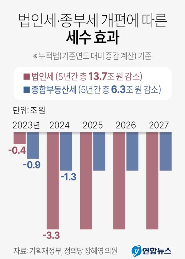 이번 국회에서 통과된 내용과 비교하면 세수 감소액은 법인세 3조5000억 원, 종부세 3조원 등 6조5000억 원이 늘어난다.