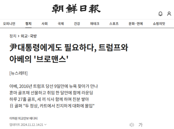 다음 날에는 “윤 대통령에게도 필요하다, 트럼프와 아베의 브로맨스”라는 제목의 기사가 이어졌다. 외교 안보 에디터를 맡고 있다는 이하원 종업원의 글이다. 2019년에 일본 제국주의자들의 전쟁 범죄를 규탄하던 한국에 경제 전쟁을 선포했던 자가 바로 아베다. 그자가 2016년에 트럼프 당선 9일 만에 뉴욕에 찾아가 고가의 골프채를 선물하고 나중에 함께 골프를 쳤단다. 마치 골프 하나면 만사가 해결될 듯한 호들갑이다. 참으로 후안무치한 일이다.