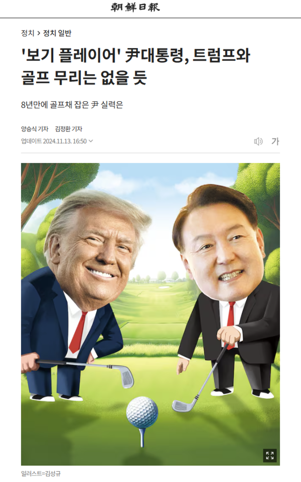 반민족, 반민주 조선일보가 난데없는 골프 타령이다. 11월11일에 김경필 종업원이 부끄러운 짓을 하고 나섰다. “‘트럼프 2기’ 대응 기구 가동....골프 연습 시작한 윤 대통령”이란 희한한 제목이다. 트럼프 2기 대응 기구 가동과 골프 연습이라니 뚱딴지가 따로 없다. 트럼프 대응 기구가 골프 연습장이라도 된다는 말인가?