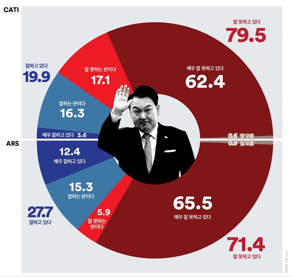 ‘여론조사꽃’이 11월 15~16일 전국 18세 이상 남녀 1004명을 대상으로 ARS 방식으로 윤석열 대통령의 국정운영에 대한 평가를 물은 결과(표본오차 ±3.1%p, 신뢰수준 95%, 기타 자세한 사항은 중앙선거여론조사심의위원회 홈페이지 참조) 27.7%가 ‘긍정’평가로 답했고, 1005명을 대상으로 전화면접 방식으로 물은 결과 19.9%가 ‘긍정’평가했다. “부정’평가는 각각 71.4%와 79,5%. 지난주 ARS조사에서는 ‘긍정’평가 22.1%, 부정평가 76.8%, 전화면접조사에서는 ‘긍정’평가 18.8%, ‘부정’평가 80.5%를 기록했었다.