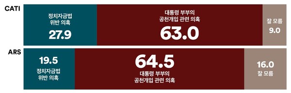 기타 명태균 씨와 김영선 전 의원 등에 대해 ‘정치자금법’ 위반 혐의로 수사하고 있는 검찰이 수사의 초점을 어디에 맞춰야 한다고 생각하는지의 물음에 대해 전화면접조사 결과 ‘정치자금법 위반 의혹’ 27.9% 대 ‘대통령 부부의 공천개입 관련 의혹’ 63.0%, ARS조사 결과 ‘정치자금법 위반 의혹’ 19.5% 대 ‘대통령 부부의 공천개입 관련 의혹’ 64.5%로 조사되어 검찰 수사의 초점이 ‘정치자금법 위반 의혹’이 아니라 ‘대통령 부부의 공천개입 관련 의혹’에 맞춰져야 한다고 생각하는 것으로 나타났다.