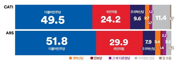 그러나 같은 기간에 진행한 ARS조사 결과, ‘더불어민주당’은 지난주보다 0.5%p 하락한 51.8%, ‘국민의힘’은 3.2%p 상승한 29.9%, ‘조국혁신당’은 2.2%p 하락한 7.9%로 조사되었다. 양당 간 격차는 21.9%p(3.7%p↓), ‘더불어민주당’+‘조국혁신당’과 ‘국민의힘’ 격차는 29.8%p(5.9%p↓)로 집계됐다.