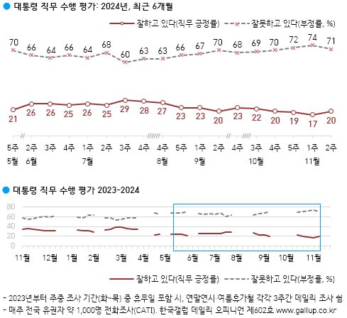 ’한국갤럽‘이 2024년 11월 셋째 주(19~21일) 전국 만 18세 이상 유권자 1001명에게 윤석열 대통령이 현재 직무를 잘 수행하고 있다고 보는지에 대해 물은 결과(표본오차 ±3.1%p 95% 신뢰수준, 기타 자세한 사항은 중앙선거여론조사심의위원회 참조), 20%가 긍정 평가했고 72%는 부정 평가했으며 그 외는 의견을 유보했다(어느 쪽도 아님 2%, 모름/응답거절 5%). ‘한국갤럽’의 윤석열 대통령 직무수행 지지율 조사에서는 11월 1주차 17%까지 떨어졌다가 지난주 11월 2주차 조사에서 20%를 회복했고 이번 3주차에서 횡보세를 보인 것이다. 그러나 부정 평가는 1% 올라 72%를 기록했다.