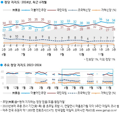 이번 갤럽 조사에서 현재 지지하는 정당은 국민의힘 28%, 더불어민주당 34%, 조국혁신당 7%, 개혁신당 2%, 진보당 1%, 이외 정당/단체 1%, 지지하는 정당 없는 무당(無黨)층 27%로 나타났다. 양대 정당은 총선 후 국민의힘 경선 기간을 제외하고는 대체로 30% 안팎에서 비등한 구도였는데, 2주 전 더불어민주당이 올해 최고치를 기록하면서 간격을 벌렸고 지난주는 그 간격을 유지한 채 양당이 동반 하락했다. 이번 주는 지난주와 거의 변함이 없다.