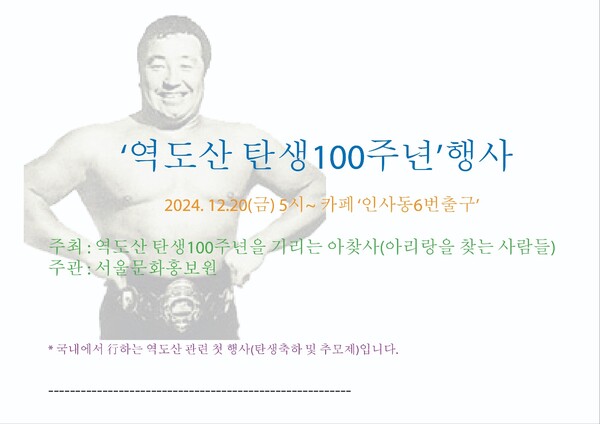 덧붙임:지난 11월 9일, 도쿄에서 역도산의 가족과 지지자들이 ‘역도산 선생 탄생 100주년’ 기념행사를 가졌다. 생일파티였다. 서울에서도 오는 12월 20일, 선생의 탄생 100주년 기념행사를 이어간다. 그동안 종종 삼삼오오 모여서 역도산을 추억하던 이들이 이번에는 집단으로 모여서 생신축하와 추모제를 합쳐서 문화제(기획총괄 김경원, 추진위원장 김병수)를 열기로 했다. 국내에서는 최초의 행사다. 뜻 있는 시민들의 관심과 참여를 바란다.