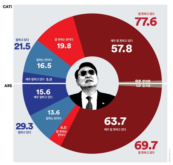 같은 시기에 진행한 ARS조사에서도 ‘긍정’평가는 1.6%p 상승한 29.3%, ‘부정’평가는 1.7%p 하락한 69.7%로 집계되었다(격차 40.4%p). 경인권과 부·울·경을 제외한 모든 지역에서 ‘긍정’평가가 상승하고 ‘부정’평가가 하락했다. 특히 충청권에서 ‘긍정’평가가 11.2%p 상승, ‘부정’평가 11.2%p 하락하며 11주 만에 부정평가가 70% 이하로 내려왔다. 연령별로 보면 70세 이상을 제외한 모든 연령대에서 ‘긍정’평가는 상승했고 ‘부정’평가는 하락했다. 60대 이하는 ‘부정’평가가 우세했고, 지난 주 초박빙을 보였던 70세 이상도 ‘부정’평가가 앞섰다. 보수층은 ‘긍정’평가가 5.3%p 상승하고 ‘부정’평가가 7.1%p 하락하며 지난 주 ‘부정’평가 앞섬에서 ‘긍정’평가 앞섬으로 변했다.(격차 7.8%p). 중도층은 ‘긍정’평가가 3.0%p 상승한 27.1%, ‘부정’평가는 72.4%(2.4%p↓)로 집계되어 45.3%p의 격차를 보였다.