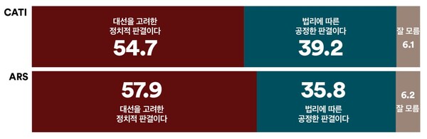 법원이 더불어민주당 이재명 대표에게 이례적으로 징역형을 선고한 것에 대해서는 전화면접조사 결과 ‘대선을 고려한 정치적 판결이다’ 54.7% 대 ‘법리에 따른 공정한 판결이다’ 39.2%, ARS조사 결과 ‘대선을 고려한 정치적 판결이다’ 57.9% 대 ‘법리에 따른 공정한 판결이다’ 35.8%로 조사되어 두 조사 모두 응답자의 과반 이상이 이재명 대표에 대한 선고가 ‘대선을 고려한 정치적 판결’이라고 응답했다.