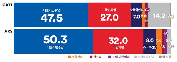 ‘여론조사꽃’의 정당 지지도 전화면접조사에서 ‘더불어민주당’은 지난 조사 대비 2.0%p 하락한 47.5%, ‘국민의힘’은 2.8%p 상승한 27.0%, ‘조국혁신당’은 2.6%p 하락한 7.0%로 조사됐다. 양당 간 격차는 20.5%p(4.8%p↓), ‘더불어민주당’+‘조국혁신당’과 ‘국민의힘’ 간 격차는 27.5%p로 집계되었다. ARS조사에서도 ‘더불어민주당’은 지난주보다 1.5%p 하락한 50.3%, ‘국민의힘’은 2.1%p 상승한 32.0%, ‘조국혁신당’은 0.1%p 상승한 8.0%로 조사되었다. 양당 간 격차는 18.3%p(3.6%p↓), ‘더불어민주당’+‘조국혁신당’과 ‘국민의힘’ 격차는 26.3%p(3.5%p↓)로 집계되었다.