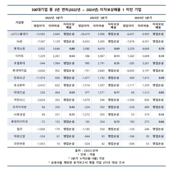 올해 3분기 기준 이자보상배율이 1 미만인 기업 중 영업손실을 기록한 기업은 LG디스플레이와 SK온, 한화솔루션, 호텔롯데, 롯데케미칼 등 29곳이다. 최근 3년 연속 이자보상배율이 1 미만인 기업은 LG디스플레이, SK온, 롯데쇼핑, 태영건설, 효성화학, 한화오션 등 16곳인 것으로 집계됐다.