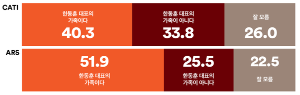 한편 국민의힘 당원 게시판에 한동훈 당대표 가족 명의로 올라온 윤석열 대통령 비판 글들을 실제 누가 작성했다고 생각하는지에 대한 질문에는 전화면접조사 결과 ‘한동훈 대표의 가족이다’ 40.3% 대 ‘한동훈 대표의 가족이 아니다’ 33.8% 대 잘 모름 26.0%로 집계되었다. 정당 지지층별로는 더불어민주당 지지층의 61.8%가 ‘한동훈 대표의 가족’이라고 응답했고, 국민의힘 지지층의 62.4%는 ‘한동훈 대표의 가족이 아니다’라고 응답하며 대립했다. 무당층은 ‘한 대표의 가족이 아니다’라고 응답한 비율(무당층: ‘한 대표의 가족이다’ 12.2% 대 ‘한 대표의 가족이 아니다’ 40.5%)이 높았다. ARS조사에세는 ‘한동훈 대표의 가족이다’ 51.9% 대 ‘한동훈 대표의 가족이 아니다’ 25.5%로 집계되었다.