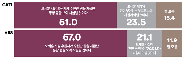 명태균 씨가 2021년 서울시장 보궐선거에서 오세훈 서울시장 당선에 관여했다고 주장하는 것에 대해 전화면접조사 결과 ‘오세훈 시장 후원자가 수천만 원을 지급한 정황등을 보아 사실일 것이다’ 61.0% 대 ‘오세훈 시장이 전면 부인하는 것으로 보아 사실이 아닐 것이다’ 23.5%, ARS조사 결과 ‘사실일 것이다’ 67.0% 대 ‘사실이 아닐 것이다’ 21.1%,로 집계되어 두 조사 모두 응답자 10명 중 6명 이상이 2021년 서울시장 보궐선거에서 오세훈 서울시장 당선에 관여했다고 주장하는 명씨의 주장은 ‘사실일 것’으로 생각하는 것으로 나타났다. 두 조사의 모든 권역과 60대 이하 모든 연령대(ARS조사의 70세 이상 포함), 남녀 모두에서 명태균 씨의 주장은 ‘오세훈 시장 후원자가 수천만 원을 지급한 정황 등을 보아 사실일 것’이라고 생각하는 것으로 나타났다.
