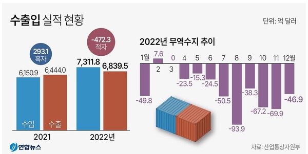 이에 따라 무역 수지는 472억 달러의 적자를 기록했다. 적자액은 종전 최대였던 국제통화기금(IMF) 외환위기 직전 1996년(206억 2000만 달러)의 2배를 넘어 역대 최대치를 경신했다. 무역수지가 연간 적자를 기록한 것은 금융위기가 닥쳤던 2008년(132억 6000만 달러 적자) 이후 14년 만에 처음이다.