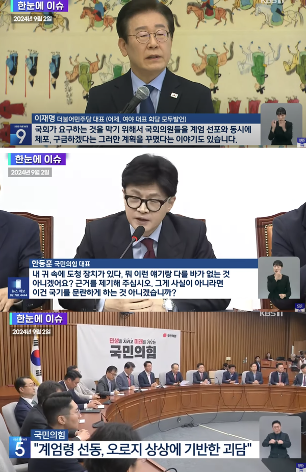 민주당과 국민의 이런 우려감에도 대통령실, 국민의힘, 정부는 시치미를 뗐다. 김용현 국방장관은 인사청문회에 나와서 “계엄 준비설은 거짓 선동” “그럴 생각이 없다” “너무 우려 안하셔도 될 것 같다”고 부인했다. 국민의힘 한동훈 대표와 추경호 원내대표도 “근거를 제시하라”고 했고, 대통령실 대변인은 “무책임한 선동이 아니라면 당대표직을 걸고 말하라”고 했다.