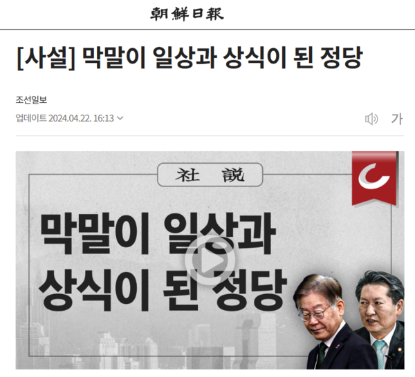 조선일보는 지난해 11월 민주당 김용민 의원이 ‘계엄 선포설’을 꺼냈을 때에도 민주당을 “막말이 일상과 상식이 된 정당”(2023년 11월29일 사설)이라며 “요즘 한 정치 영화(‘서울의 봄’)의 흥행에 올라타려 괴담을 한 것”이라고 비아냥댔다. 이 매체의 배성규 기자는 방송에서 한 어용 교수가 “탄핵과 계엄에 중독된 이재명 민주당이 대한민국을 아수라판으로 만들고 있다”고 한 말을 기사로 쓰기도 했다.