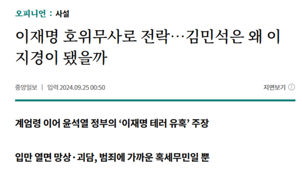 친윤 어용 논조로 조선일보를 추월하고 싶어하는 중앙일보도 지난 9월25일자 사설에서 ‘계엄 준비설’을 주장한 민주당 김민석 의원을 향해 “이재명 호위무사로 전락해 입만 열면 망상과 괴담 뿐”이라면서 “(김민석 의원이) 왜 이 지경이 됐을까”라고 조롱했다.