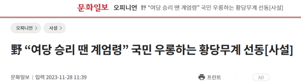 조선일보 아류 매체로 전락한 서울신문도 김민석 의원에게 “북한군 파병 규탄 결의안을 주도해도 모자랄 판국에 이 무슨 황당무계한 대응인가”라고 ‘윤 정권 계엄 준비설’을 적극 은폐했다. 어용 보도로는 조선일보를 능가하는 문화일보는 지난해 11월28일 “야 ‘여당 승리 땐 계엄령’..국민 우롱하는 황당무계 선동” 제목의 사설에서 민주당에 “국민을 개돼지 수준으로 낮춰 보면서 비이성적 논리로 현혹하는 혹세무민 선동이 개탄스럽다”고 썼다.