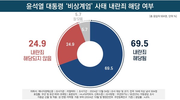 한편, 윤이 빚은 비상계엄 사태가 내란죄에 해당하는지 여부를 물어본 결과, ‘해당된다’라는 응답이 69.5%로 국민 2/3 이상이 이번 사태를 내란죄로 보는 의견을 보였다. 한편, ‘해당되지 않는다’라는 응답은 24.9%로 나타났다.