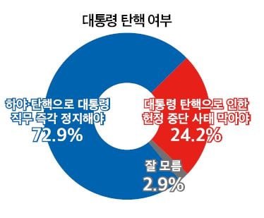 ‘윤 대통령의 탄핵 여부에 대해 어떻게 생각하는지’ 묻는 질문에 전체 응답자의 72.9%는 “하야 내지 탄핵으로 대통령 직무를 즉각 정지해야 한다”고 답했고 24.2%는 “대통령 탄핵으로 인한 헌정 중단 사태는 막아야 한다”고 했다.(‘잘 모르겠다’ 2.9%)