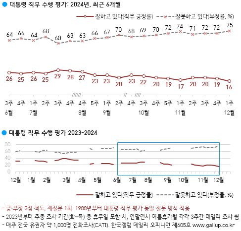한편 한국갤럽이 12월 첫째 주(3~5일) 전국 만 18세 이상 유권자 1001명에게 윤석열이 현재 직무를 잘 수행하고 있다고 보는지에 대해 물은 결과(표본오차 ±3.1%p 95% 신뢰수준, 기타 자세한 사항은 중앙선거여론조사심의위원회 참조) 16%만이 긍정 평가했고 75%는 부정 평가했다. 9%는 의견을 유보했다.