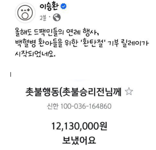 이 씨는 "여러분께서는 늘 그렇듯 '한국백혈병어린이재단'으로 후원해 주시면 된다"면서 "여러분이 나의 자랑이고 배후다. 감사하다"라고 덧붙였다.