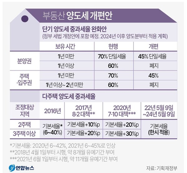 정부는 다주택자 양도세 중과 한시 배제가 2024년 5월까지 연장 시행된 점을 감안해 올해 연말 정기 국회 때 전체 세법 개정안을 일괄 추진해 내년부터 시행할 계획이다.