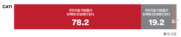 한국갤럽이 12월 10~12일 사흘 간 전국 유권자 1002명에게 대통령 윤석열 탄핵에 대한 찬반 여부를 물은 결과(표본오차 ±3.1%p, 95% 신뢰수준, 기타 자세한 사항 중앙선거여론조사심의위원회 홈페이지 참고) 75%가 찬성, 21%가 반대했다. 4%는 의견을 유보했다. 국민의힘 지지층에서만 유일하게 탄핵 반대(66%)가 우세하고, 70대 이상, 성향 보수층 등에서는 찬반 격차가 크지 않다. 2016년 12월 당시 박근혜 대통령 탄핵소추안 국회 표결 직전 조사에서는 탄핵 찬성 81%, 반대 14%였다. 그때도 여당인 새누리당 지지층(136명)에서는 찬성(34%)보다 반대(61%)가 우세했고, 성향 보수층(260명)에서는 찬성(66%)이 많았다.