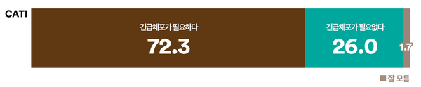 ‘여론조사꽃’이 11일부터 12일까지 양일간 1466명 대상으로 실시한 전화면접조사(표본오차 ±2.6%p 95% 신뢰수준)에서는 윤석열 탄핵 필요성에 대해 ‘필요하다’ 80.5% 대 ‘필요하지 않다’ 17.8%로 조사되어 10명 중 8명은 윤석열 대통령의 탄핵이 필요하다고 생각하는 것으로 나타났다. 특히 탄핵이 ‘매우 필요하다’는 응답이 72.0%로 압도적으로 높아 계엄령 선포 이후 윤대통령의 탄핵 찬성 여론이 거세짐을 알 수 있다.
