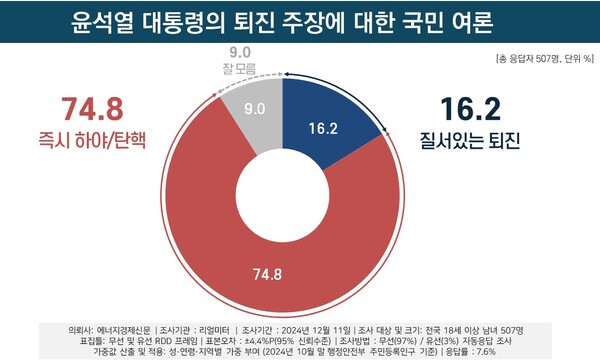 리얼미터가 에너지경제신문 의뢰로 11일(수) 하루 전국 만 18세 이상 507명을 대상으로 실시한 자동응답방식 조사(표본오차 ±4.4%p, 95% 신뢰수준)에서도 ‘즉시 하야나 탄핵으로 대통령 직무를 정지시켜야 한다’는 의견이 74.8%로 압도적으로 높은 비율을 보였다. ‘여당의 제안대로 질서있는 퇴진을 해야한다’는 의견은 16.2%에 그쳤다. ‘잘 모름’은 9.0%. 리얼미터 관계자는 74.8%라는 수치는 윤석열 탄핵 관련, 지금까지 조사 중 가장 높은 수치이며, 이 수치대로라면 토요일 예정된 국회 탄핵 표결에서 230~240명의 찬성표를 기대할 수 있다“고 말했다. 2016년 12월 박근혜 탄핵 국면 때 탄핵 표결 직전 탄핵 여론이 78%였고 국회 탄핵 찬성 표수도 정확히 78%인 234명이었다는 것이다.
