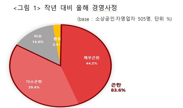 자영업자와 소상공인의 경영난은 점점 심해지고 있다. 지난해와 올해 경영 사정을 비교하는 질문에 10명 중 8명 이상이 더 힘들어졌다고 답했다. 매우 곤란해졌다는 응답이 44.2%를 차지했고, 다소 곤란도 39.4%에 달했다. 비슷하다는 응답은 14.0%, 원활하다는 답변은 2.4%에 불과했다.