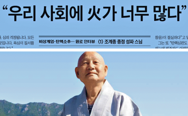 ‘원로인터뷰 시리즈’의 첫 번째로 조계종 종정 성파 스님을 만난 조선일보 기자는 경남 양산 통도사의 서문암을 찾아 “국회의 대통령 탄핵이라는 격랑 속에 빠진” 속세에서 떨어진 ‘적막한 산사’에서 노스님으로부터 “헌법재판소 탄핵심판 과정에서 분열과 갈등이 염려된다” “타협하고 경청하는 인성교육과 인욕(忍辱)이 절실하다”는 가르침을 전했다.