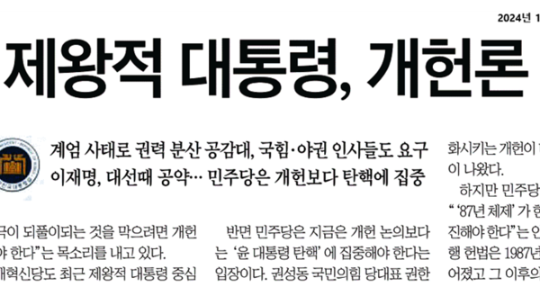 ‘탄핵보다 개헌부터 하자’는 주장을 ‘보수’ 정치권과 언론이 확산시키려 하고 있다. 국민의힘의 권성동 당대표 권한대행이 18일 이재명 더불어민주당 대표를 만난 자리에서 “대통령 중심제가 우리 현실에 맞는지 검토할 필요가 있다”는 말을 하자 조선일보가 이를 받아 19일 아침 1면 머릿기사 <수명 다한 제왕적 대통령, 개헌론 확산>으로 발빠르게 화답했다. 국민의힘과 조선일보 간에 장단을 맞추는 이 같은 움직임에서는 탄핵 국면을 개헌 국면으로 전환해 보려는 의도가 분명하게 보인다.