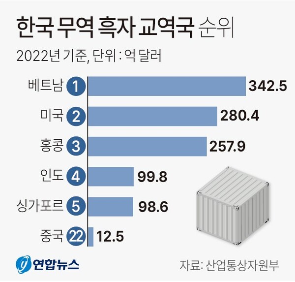 지난해 한국의 무역 수지 흑자는 베트남에 이어 미국(280억4000만 달러), 홍콩(257억9000만 달러), 인도(99억8000만 달러), 싱가포르(98억6000만 달러) 등의 순이었다.
