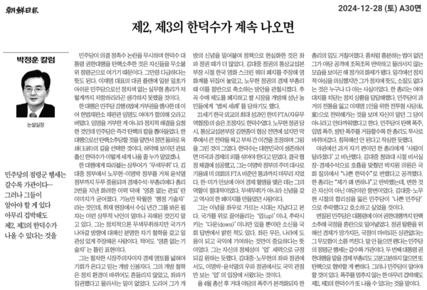 ‘꼴값 떤다’는 말이 있다. ‘격에 맞지 아니하는 아니꼬운 행동을 하다’는 뜻이다. 속되게는 ‘생긴 얼굴에 어울리는 말과 행동을 하다’로 쓴단다. 내가 박정훈 기자의 얼굴을 알 바 없으니 조선일보의 격에 어울리는 말과 행동을 한다는 정도로 해둔다. 민족을 배반하고 독재에 대한 아부로 일관해 온 집단답다. 제2, 제3의 한덕수가 나와야 한다는 얼치기 무당의 불길한 저주로 들린다. 대한민국을 결딴내고야 말겠다는 음흉한 주문으로도 읽힌다.