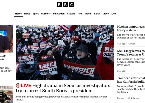 3일 오전 영국 <BBC>는 “서울에서 수사관들이 한국 대통령을 체포하려 시도하는 긴박한 상황”이 벌어지고 있다는 제목으로 수사관과 경호대원들이 대치 중인 관저 내부 상황과 대통령 지지자들이 진을 치고 있는 그 주변 상황을 온라인 머리기사로 실시간으로 전했다.