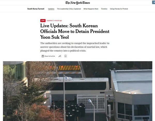 <뉴욕타임스>도 1면 주요 기사로 제목에 ‘실시간 업데이트’를 박아 놓고 “한국 관리들이 윤석열 대통령을 구금하기 위해 이동, 당국은 계엄령 선포로 나라를 정치적 위기에 빠뜨린, 탄핵당한 지도자에 대한 수사를 강제하려 하고 있다”고 관저 주변상황을 실시간으로 전했다.