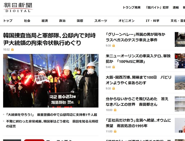 <아사히신문>은 윤 대통령 구속영장 집행을 둘러싸고 “한국 수사당국과 군부대가 관저 내에서 대치”하고 있다면서, ‘불발로 끝난 비상계엄, 한국군은 어떻게 바뀌었는지 지난 일을 얘기하는 전 장교의 증언’ 등 관련 기사들도 함께 실었다.