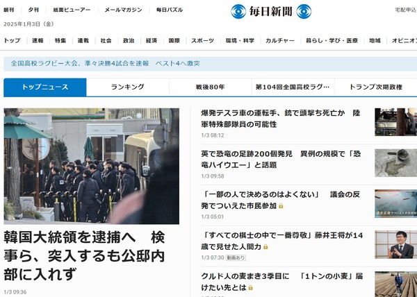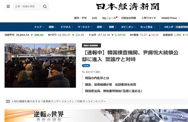 <일본경제신문>(닛케이)도 ‘속보중’임을 알리면서 “한국 수사기관이 윤석열 대통령 관저에 진입해 경호처와 대치” 중인 소식을 신속하게 전했다.