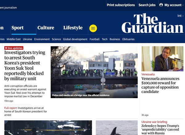 <가디언>은 “수사관들이 윤석열 대통령을 체포하려다 경호대와 대치중”이라는 사실을 온라인 ‘최신 소식’으로 전했다.